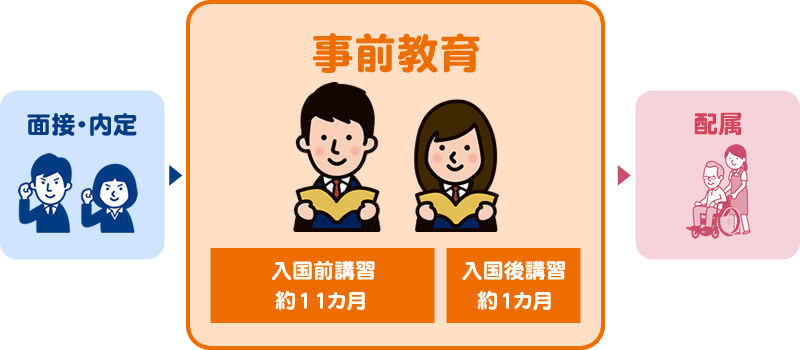 ロイヤル事業協同組合では、事前教育に力を入れている送り出し機関からのみ技能実習生の受け入れを実施しているため、比較的長い教育期間を要します。介護技能実習生は、面接・内定後、約11か月日本入国前講習にて日本語および介護技能を学び、入国後は当組合管轄による約1か月の入国後講習を行った後、企業様への配属となります。